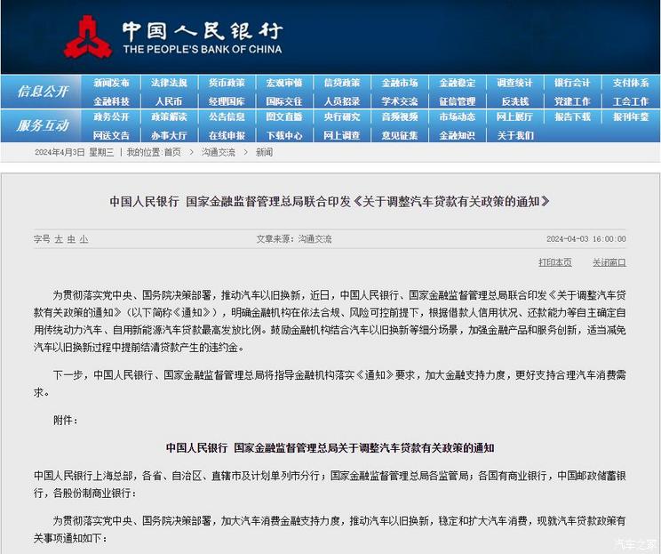 [本站 资讯] 4月3日,中国人民银行、国家金融监督管理总局联合印发《关于调整汽车贷款有关政策的通…