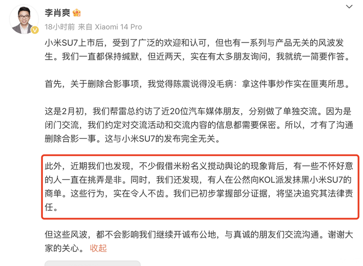 [本站 资讯] 日前,小米汽车副总裁李肖爽发布微博称,“近期我们发现,不少假借米粉名义搅动舆论的现…