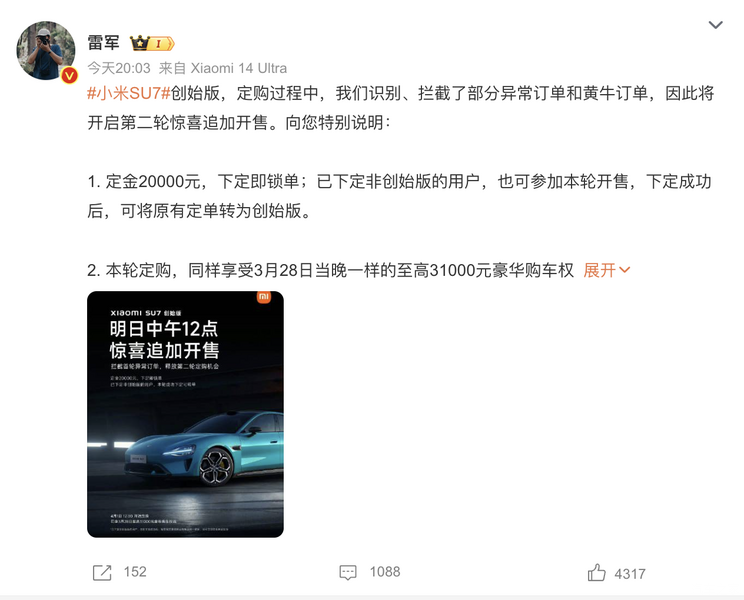 [本站 资讯] 日前,雷军发布微博称“小米SU7创始版订购过程中,识别、拦截了部分异常订单和黄牛订…