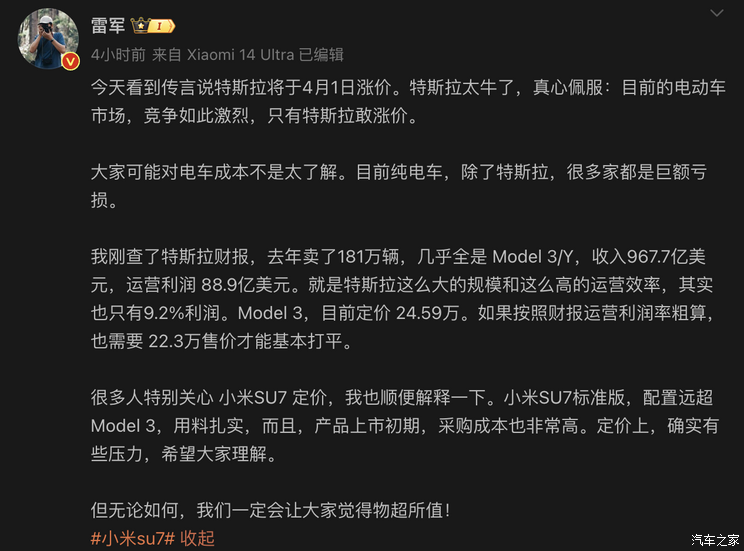 [本站 资讯] 日前,小米董事长兼CEO雷军在个人微博就特斯拉涨价发表看法,并提到即将上市的小米S…