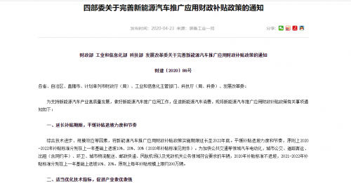 近日,四部委联合发布了新能源车型补贴政策调整的通知,表示原则上2020—2022年补贴标准分别在上一年基础上退…