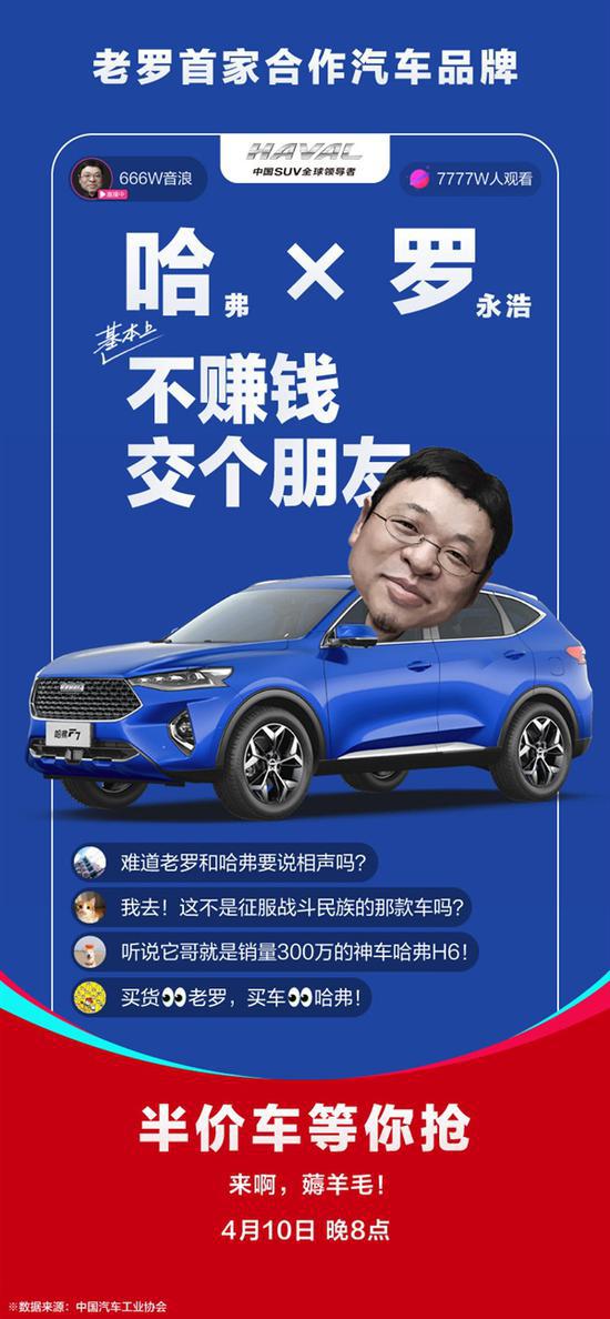 锤子科技CEO罗永浩要卖车了。 4月9日消息,哈弗官方宣布成为罗永浩首家合作的汽车品牌,4月10日晚上8点罗永…