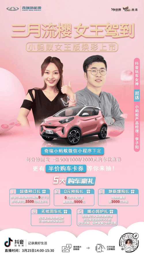 3月25日,“三月流樱 女王驾到 小蚂蚁女王版焕彩上市”暨首届奇瑞小蚂蚁云上购车节直播购车活动成功举行。整场直…