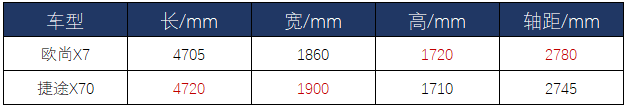 对比发现,捷途X70在长度和宽度方面分别领先15mm和40mm,宽体式的设计不仅让捷途X70空间更大,还看着更加动感,同时有助于提升行驶稳定性;而欧尚X7轴距的尺寸较大,带来更大的腿部空间。