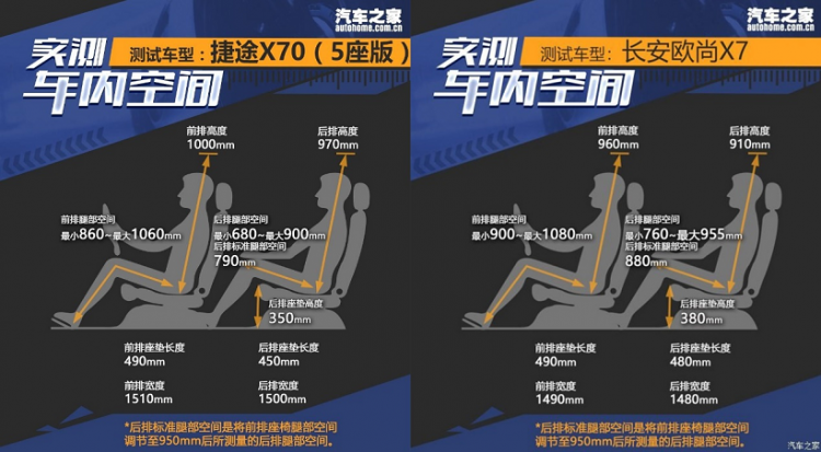 从实际乘坐感受的话,还是捷途X70要更舒服一些。汽车之家实测数据显示,捷途X70在前后排的高度和宽度都比欧尚X7有明显优势,意味着头部空间和肩部空间更大,避免了顶部压抑感和横向拥挤感。