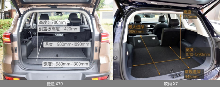 后备箱方面,两款车的后排座椅都支持4/6比例放倒,地板也很平整。具体来看,捷途X70的后备箱各个尺寸几乎全面超越欧尚X7,而且还提供遮物帘,能够对物品进行分区放置,非常实用。