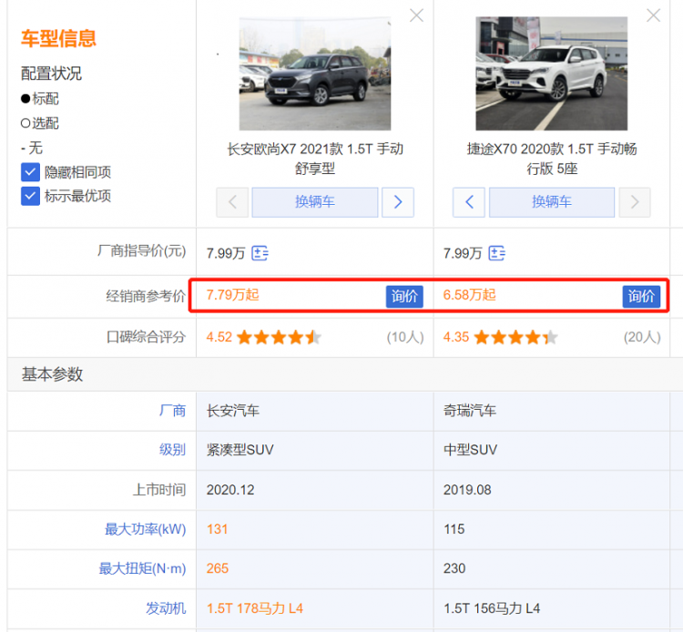 为了更直观地进行两车的配置对比,我们分别选取两款价格相近的版型,市场价都在8万元左右。