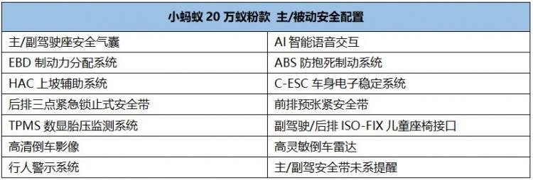 除车身、三电安全之外,主/被动安全配置也直接关系到车辆的安全性能。小蚂蚁20万蚁粉款“金钟罩”第三式:配备了全面、先进的主/被安全配置,全方位守护用户安全,同时也体现出奇瑞新能源在安全质量问题方面的诚意。