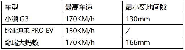 宋Pro EV和奇瑞大蚂蚁都采用了常见的前麦弗逊独立悬架以及后多连杆独立悬架,而小鹏G3采用的是前麦弗逊式独立悬架/后扭力梁式半独立悬架。但是奇瑞大蚂蚁拥有同级最优离地间隙与接近角和离去角,加上同轴距最小转弯半径,让用户无论在拥挤的城市道路,还是路况复杂的郊区,都能够轻松应对。媲美专业越野车型的同级领先最小离地间隙,让奇瑞大蚂蚁拥有了更好的通过性。