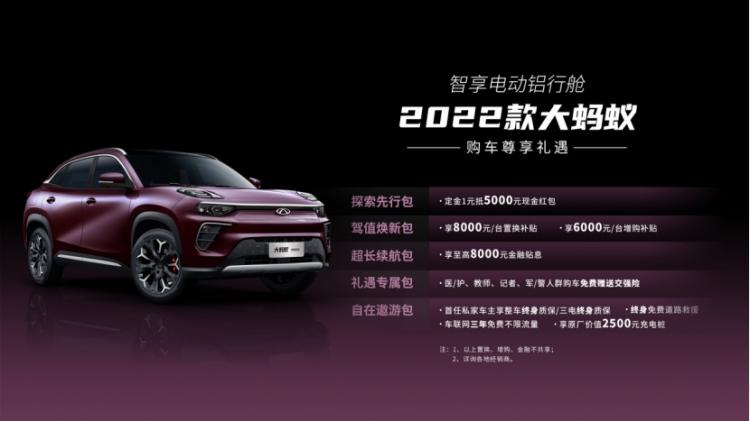奇瑞新能源全新2022款大蚂蚁现已上市,预订即享五重礼包,更可享受蚂蚁家族终身质保服务!