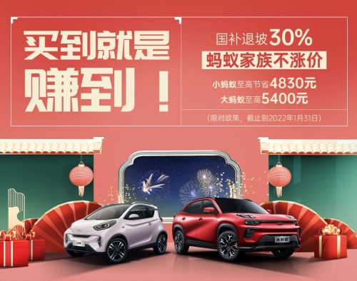 作为绿色智慧出行生活引领者,奇瑞新能源始终践行“客户至上”的理念,凭借20余年深厚技术积淀,打造高品质的产品矩阵,为用户提供生态便捷的出行生活。此次针对国家补贴“退坡30%”,奇瑞新能源承诺涨价,截止2022年1月31日,选购蚂蚁家族不涨价,小蚂蚁至高可节省4830元,大蚂蚁至高节省5400元,买到就是赚到,真正为消费者解决购车涨价之忧!同时奇瑞新能源还为用户带来“蚁起中国年”促销活动!不仅可以任意选购心仪的爱车,还可以享受多种钜惠福利,“蚁起中国年”温情暖冬。