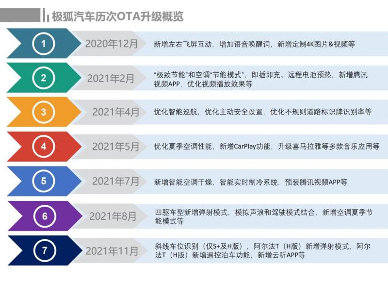 在汽车智能化的今天,OTA升级的迭代速度已经成为衡量车企研发实力的重要标准。自2020年12月至今,极狐汽车针对相关车型完成了7次OTA升级,平均推送周期不到2个月,累计完成92项新增和优化升级,其更新速度之快在整个业内处于领先水平,在功能实现和用户需求解决上远超同级竞品。