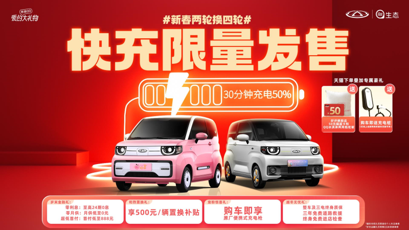 为回馈广大用户对奇瑞QQ冰淇淋长久地关注和支持,在双十二到来之际,奇瑞新能源“快充限量发售”活动火热进行中。限量1000台奇瑞QQ冰淇淋快充&100台QQ冰淇淋·桃欢喜快充,在天猫奇瑞新能源旗舰店购车送专属豪礼。12月12日更有叶一茜、李艾、一栗小莎子等20位明星红人直播,下单购QQ冰淇淋·桃欢喜即送充电桩,更有5折锦鲤车超级福利,鸿运当头,嗨购正当时!