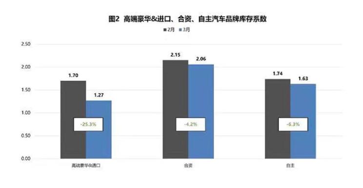 高端豪华&进口品牌库存系数为1.27,环比下降25.3%;合资品牌库存系数为2.06,环比下降4.2%;自主品牌库存系数为1.63,环比下降6.3%。