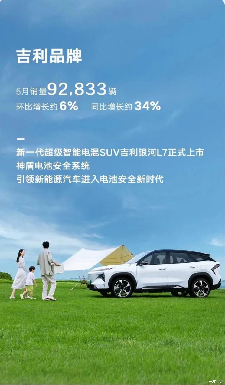 [本站 资讯] 6月5日,吉利汽车控股有限公司(0175.HK)公布最新销量数据:5月乘用车销量120053辆,环比增长6%,同比增长约35%;5月,新能源(含吉利、领克、极氪、睿蓝)销量27036辆,同比增长约38%,新能源渗透率持续攀升。