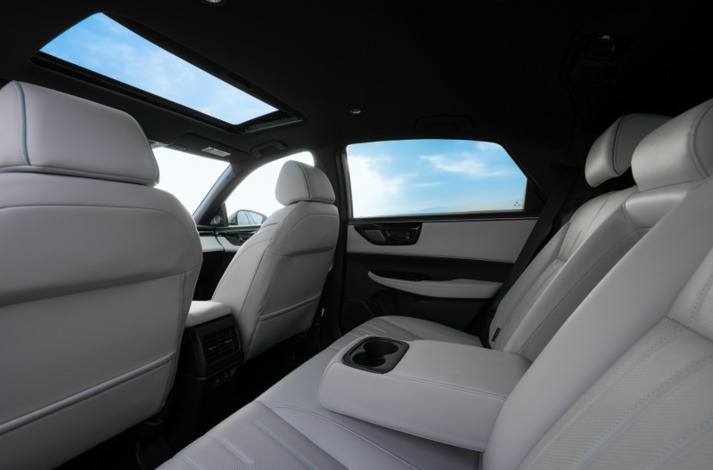 与清爽简洁内饰相匹配的,是空间利用率更高且更灵活的车内空间设计。考虑到纯电车型不需要安装变速箱结构,因此e:NP2极湃2去掉了前排中控隔断,将此处利用起来设计成贯通式的前排空间,在提升空间利用率的同时,用户也能在狭窄的停车位以及充电站自由选择上下车方向。而在后排,得益于宽敞的腿部空间和座椅靠背角度调节功能,e:NP2极湃2能够为用户带来更加舒适自在的乘坐体验。在车尾的置物空间方面,e:NP2极湃2凭借Hatchback掀背式车身的设计优势,拥有更大的后备厢开口面积,实现更便利的取放行李体验,而在放倒后排座椅后,纯平的置物空间也能够更加轻松地放下大件的家电或装备。
