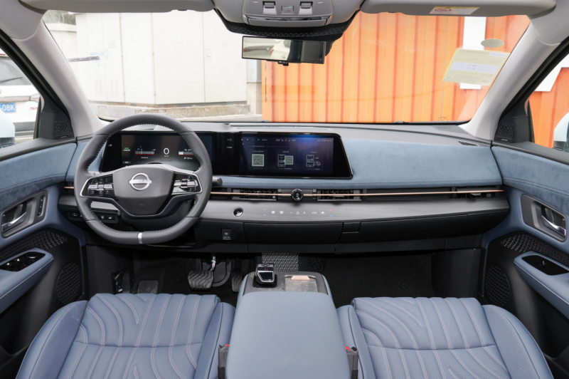 在内饰方面,e:NP2极湃2采用了一套清爽数字科技座舱设计,12.8寸中控屏,搭配轻薄仪表以及大尺寸HUD,构成了车内的三屏联动显示效果。不同于传统车型液晶仪表为主,HUD为辅的显示布局,e:NP2极湃2将更多的车辆信息集中在HUD上进行显示,轻薄的仪表仅显示车速、指示灯等基础信息,得益于HUD能够投射在更居中的位置上,驾驶员可以不用低头看仪表或中控屏,就能快速掌握车辆信息,大大提升了驾驶员行车专注度以及行驶安全性。而简化处理的仪表,让车辆前方的仪表台呈现出完全水平的视觉效果,设计更加简洁的同时,也带来了更好的驾驶视野。
