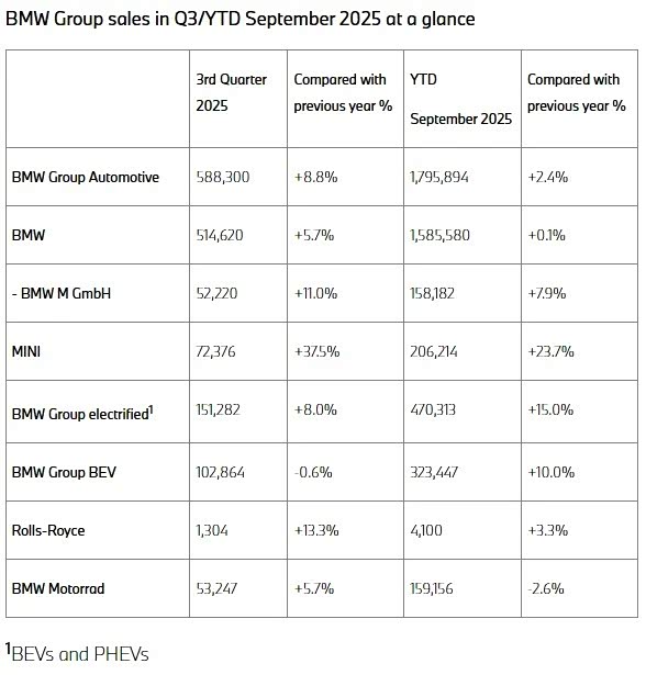 [本站 资讯] 日前,宝马集团正式公布2025年第三季度及前三季度汽车交付数据。数据显示,2025年第三季度,宝马集团共交付汽车58.83万辆,较去年同期增长8.8%;截至9月底,集团累计交付BMW、MINI及劳斯莱斯三大品牌汽车1,795,894辆,约合180万辆,较去年同期微增2.4%,整体经营节奏保持稳定。