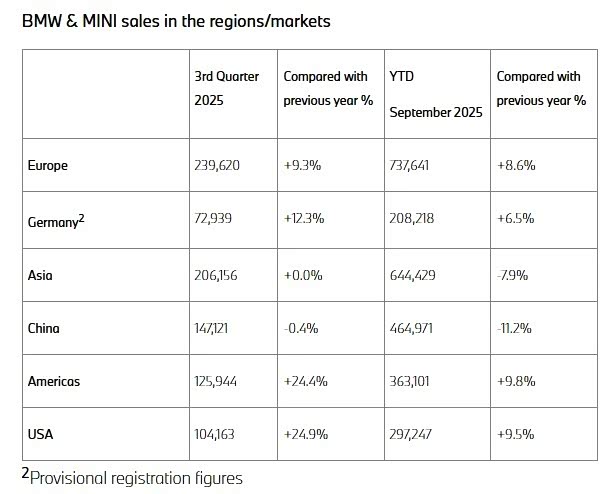 区域市场方面,宝马集团呈现“欧美强劲、亚洲平稳”的格局。欧洲市场第三季度交付239,620辆,同比增长9.3%,前三季度累计交付737,641辆,同比增长8.6%,其中德国本土市场第三季度交付72,939辆,同比增长12.3%;美洲市场增长更为显著,第三季度交付125,944辆,同比增长24.4%,前三季度累计交付363,101辆,同比增长9.8%,美国市场作为核心区域,第三季度交付104,163辆,同比增长24.9%。亚洲市场第三季度交付206,156辆,同比持平(+0.0%),前三季度累计交付644,429辆,同比下降7.9%,其中中国市场第三季度交付147,121辆,同比微降0.4%,前三季度累计交付464,971辆,同比下降11.2%,整体受区域市场竞争环境影响呈现小幅调整。