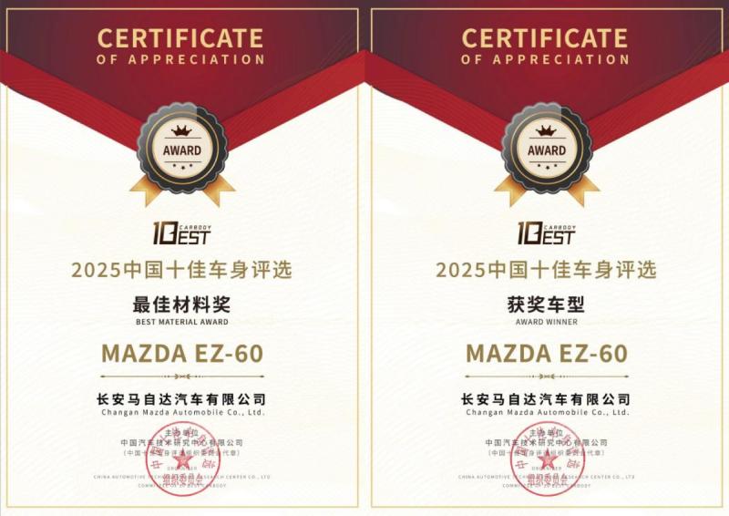 “中国十佳车身”评选是国内车身技术领域的最高荣誉,评选标准涵盖结构强度、制造工艺、材料创新等六大维度。EZ-60凭借领先的车身技术斩获“2025十佳车身”与“最佳材料”双奖。长安马自达作为钢铁巨头宝钢20年战略合作伙伴,EZ-60的每一片钢材都可追溯源头,车顶横梁更是采用双方联合开发的1470MPa世界最高强度冷冲压件,用技术创新构筑安全根基。整车7横5纵的笼式铠甲车身中,86.5%为高强钢,其中27.45%是热成型钢,最高强度达2000MPa,超1500MPa的超高强度零件集群多达50个,形成密集的安全防护网。