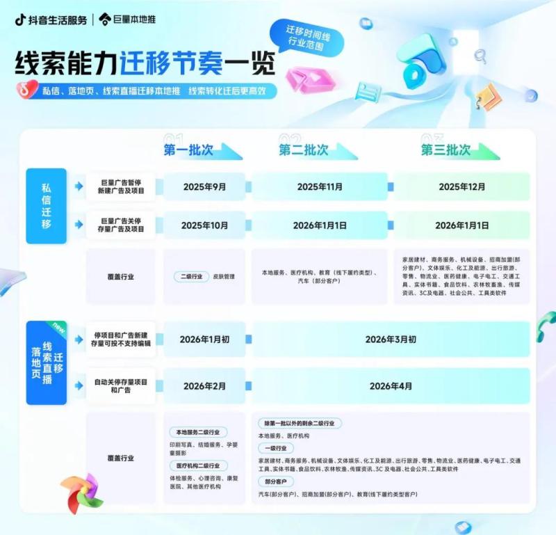 为更好的完善巨量本地推的产品生态,满足商家最新、最迫切的营销需求,平台将私信、营销页、线索直播为代表的各线索能力陆续迁移至巨量本地推,为保证存量项目正常运转,迁移动作将分多批次进行,以下为具体迁移节奏及覆盖行业范围。