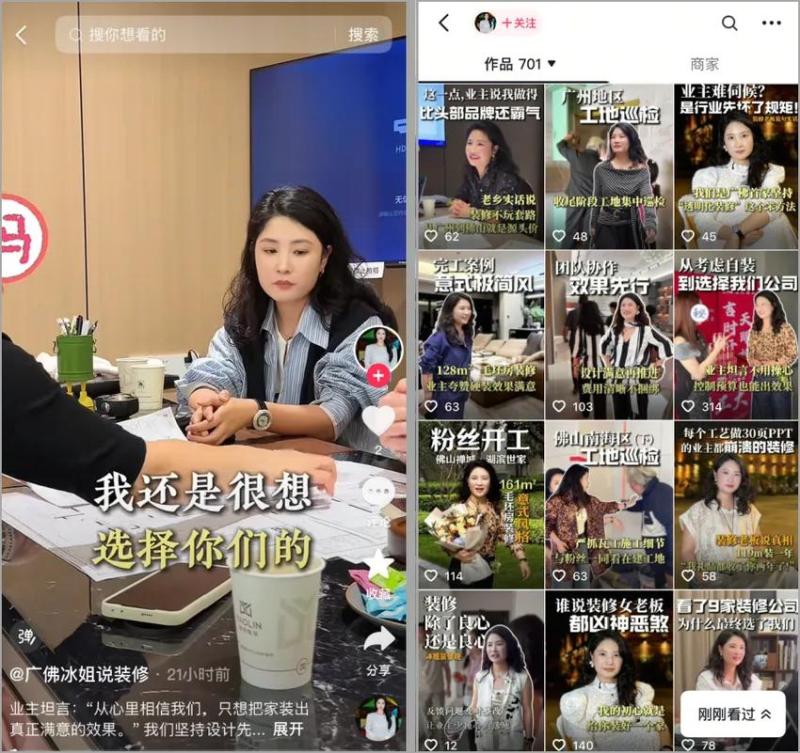 一方面,在内容创作上,冰姐通过和业主沟通,提炼用户真正关心的问题和痛点进行创作,比如“装修期间如何控制好时间和预算成本,避免额外的投入”,让用户很快感知到这不是剧本演绎,从而快速建立信任。