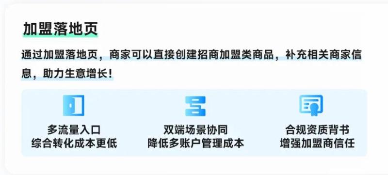 对于有加盟需求的商家,平台现在还支持「招商加盟页」,商家可以直接创建招商加盟类商品,补充商品信息。平台也在流量、经营和资质方面助力商家生意增长。