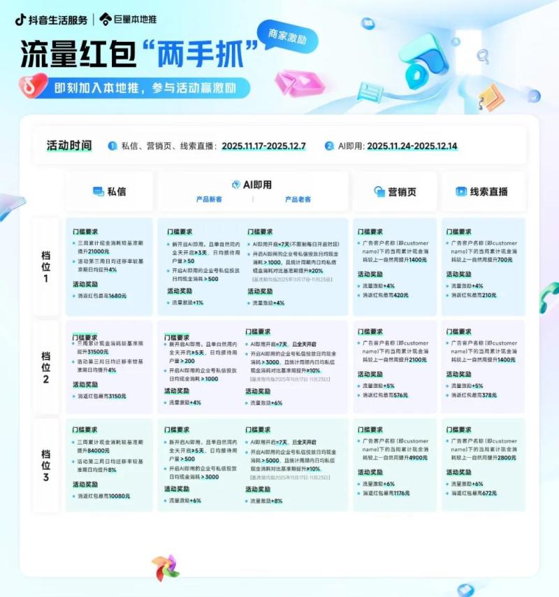 运营社了解到,无论是私信、营销页和线索直播三大链路,还是 AI 即用这种新功能,只要商家加入本地推开始使用,就能够获得流量+红包两个方面的双重激励,进一步降低入推的经营难度和成本压力,其诚意可见一斑。