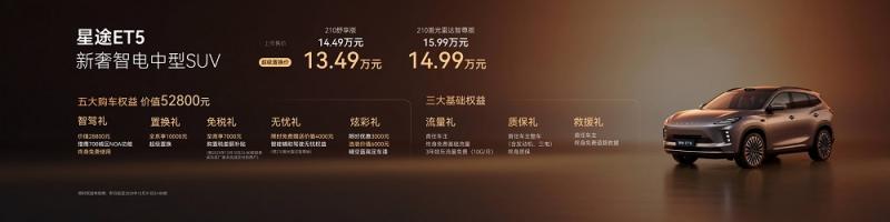 11月28日,在坐拥粤港澳大湾区核心区位的世界级城市珠海,星途汽车正式发布“新奢智电中型SUV”星途ET5。新车共推出210舒享版、210激光雷达智尊版两款配置,官方指导价14.49万元-15.99万元,超级置换价13.49万元-14.99万元以诚意满满的价格回馈用户,并重磅宣布猎鹰700城区NOA功能终身免费使用。价值52800元五大购车权益、三大基础权益下定即享。