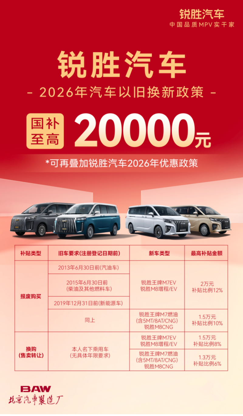 随着春节临近,汽车市场迎来新一轮消费热潮。在此背景下,北京汽车制造厂旗下的锐胜M8推出“六重新春专属购车礼”,与国家以旧换新政策形成合力,为消费者带来实实在在的购车利好。对于计划在年初置换一台全场景大型MPV的用户而言,这无疑是完成座驾升级、把握政策红利的最佳时机。