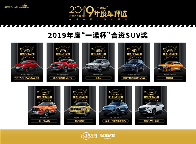 “一诺杯”SUV奖,分别是一汽-大众TACQUA探影荣获年度潜力新品SUV、北京现代新一代ix25荣获年度时尚新锐SUV、上汽斯柯达柯米克GT荣获年度潮酷劲彩SUV、东风Honda CR-V荣获年度魅力悦行SUV、一汽丰田全新RAV4荣放荣获年度卓逸畅行SUV、全新一代别克昂科拉GX荣获年度运动性能SUV、上汽大众途观L荣获年度家享杰出SUV、全新一代路虎揽胜极光荣获年度全能锋尚SUV、奥迪Q8荣获年度豪华旗舰SUV。