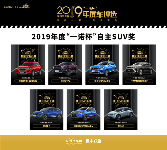另外,全新哈弗H6铂金版荣获年度高光成就SUV、捷途X95荣获年度嘉旅舒享SUV、荣威RX5 MAX荣获年度科创领潮SUV、SWM斯威G01 F荣获年度创界新锐SUV、哈弗F7荣获年度超值国民SUV、比亚迪2019款元EV荣获年度智酷纯电SUV、哪吒U荣获年度智领未来SUV。