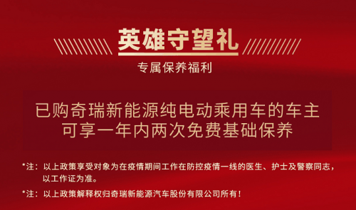 值得一提的是,防疫英雄们在享受本次专属感恩政策的同时享受三电终身质保政策:这三款车型的首任非营运车主,都可以享受奇瑞新能源提供的包括动力电池(电芯)、驱动电机(含电机控制器)、整车控制器终身质保服务,为用户提供优惠实在的贴心服务,从实际出发解决用户的使用焦虑,实现全生命周期的用心呵护和贴心陪伴。