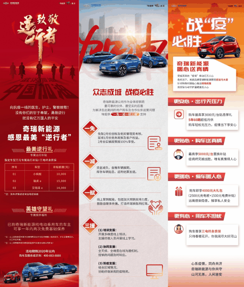 疫情防控期间,奇瑞新能源公司也开展了包括线上看车&购车服务、24小时在线服务等五大防疫服务和支持经销商政策,以及针对一线人员的“致敬逆行者”多重购车优惠政策服务等措施,展现了作为民族企业的高度社会责任感。为解决疫情期间用户购车及合作伙伴运营问题,奇瑞新能源特提供“一免一减一赋三援”支持;为致敬一线工作人员,奇瑞新能源推出“最美逆行礼”专属补贴及“英雄守望礼”专属保养福利,以出色的产品和服务为广大用户带来更安心更安全的出行生活体验。
