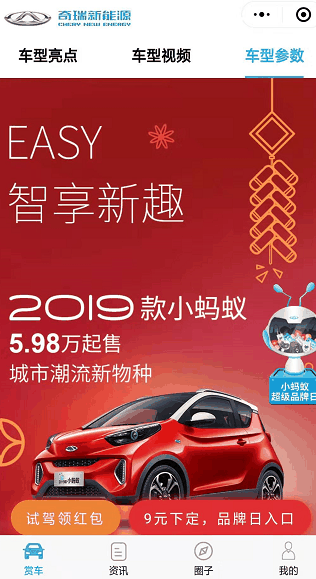 值此奇瑞新能源小蚂蚁上市三周年之际,为回馈广大用户,即日起购买2019款小蚂蚁的用户即可享受“超值预定礼”、“0元易购礼”、“焕新增购礼”、“无忧用车礼”和“暖心呵护礼”五重豪礼,从买车、用车、养车全方位的呵护用车安全,带来满满诚意,不容错过。