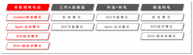 值得一提的是,除了ECO 超经济驾驶模式,菲斯塔纯电动还提供经济(ECO)模式、舒适(Comfort)模式和运动(Sport)模式,丰富的驾驶模式选择让它在几何A高维版、轩逸•纯电、朗逸纯电面前,更具竞争优势。