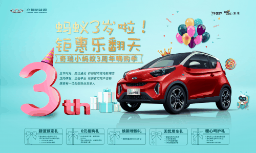 在奇瑞新能源小蚂蚁三周年之际,奇瑞新能源特别推出了“小蚂蚁三岁啦,钜惠乐翻天”嗨购季活动。活动期间,购买小蚂蚁女王版及2019款小蚂蚁均可享受“超值预定礼”、“0元易购礼”、“焕新增购礼”、“无忧用车礼”和“暖心呵护礼”五重豪礼,多种金融方案有效降低购车门槛;基础保养终身免费、 三电终身质保等服务,让用户享受出行无忧生活;以满满诚意为用户提供从买车、用车、养车全方位的呵护。