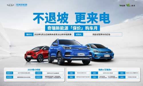 即日起至5月31日,购买奇瑞新能源汽车的消费者可续享2019 年补贴政策,不管补贴政策如何退坡,购买奇瑞新能源车型都不涨价,消费者的购车忧虑不再是问题。另外,活动期间到店试驾还可享受99元红包,以诚意十足的红包福利,为用户打造更贴心便捷的试驾购车体验。