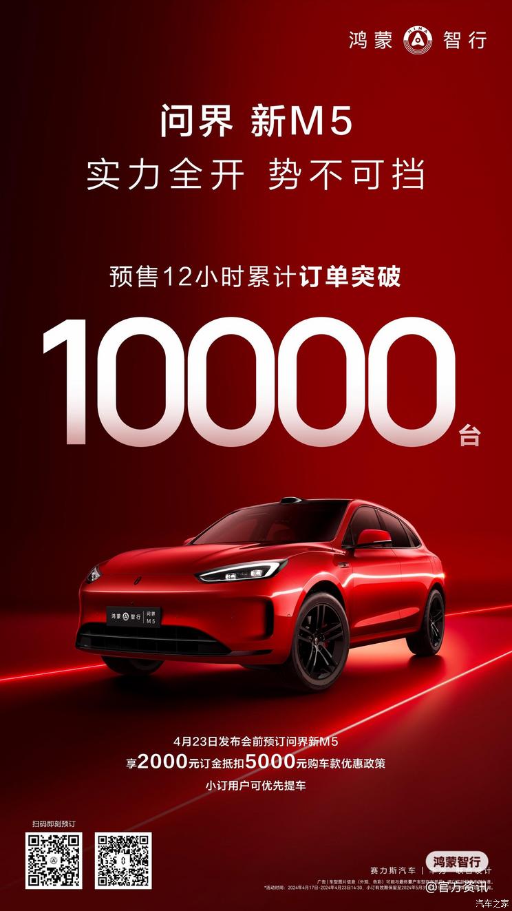 [本站 资讯]4月17日,新款问界M5开启预订,鸿蒙智行官方表示,新款问界M5预售12小时累计订单突…