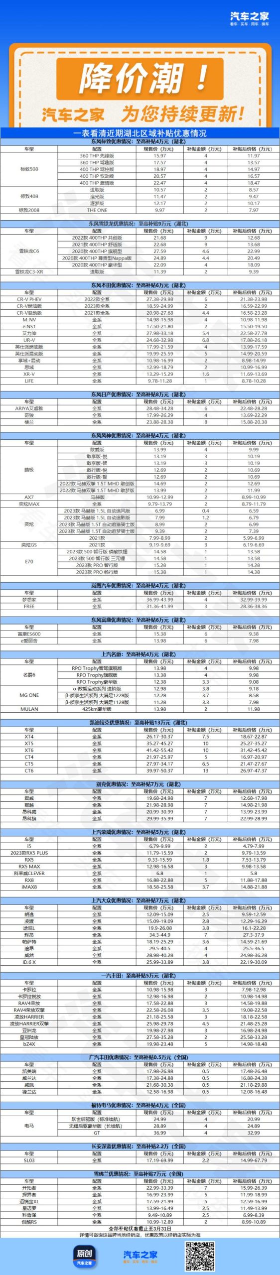 [本站 资讯]日前,多个汽车品牌与湖北政府联合推出补贴优惠活动,这一次,我们统计了针对湖北省及全国范…