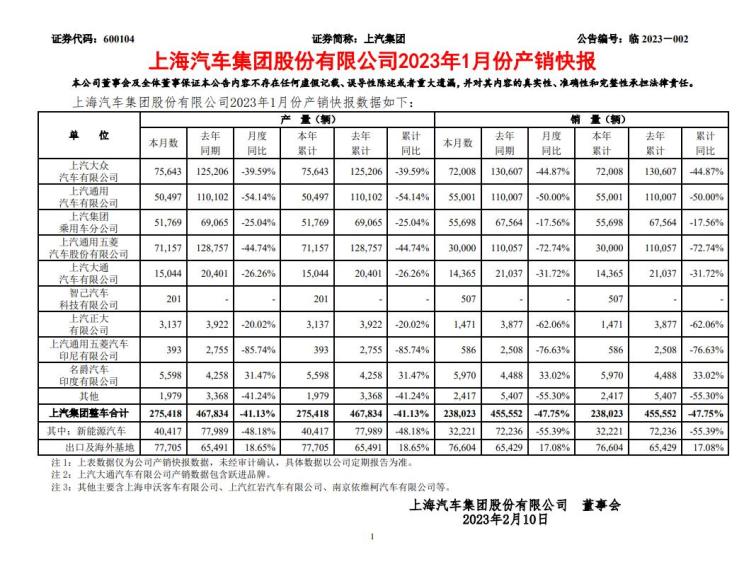 [本站 资讯] 2月9日,上汽集团公布1月份产销快报。数据显示,上汽集团1月实现产销量分别为27.5…