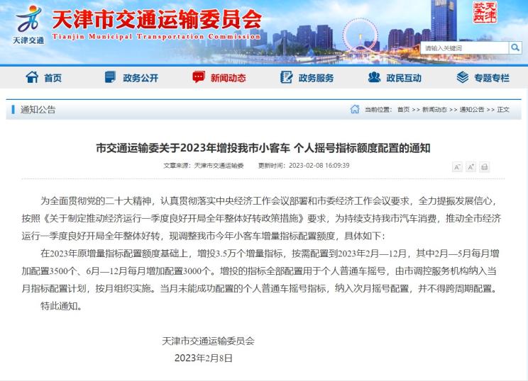 [本站 资讯] 近日,天津市交通委员会发布了《市交通运输委关于2023年增投我市小客车个人摇号指标…