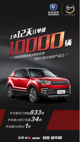 长安CS55自7月26日上市以来,短短12天的时间订单量已破万。12天订单破10000辆是什么意思呢?意味着平…