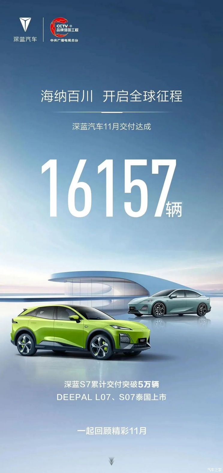 [本站 资讯] 12月1日,我们从深蓝汽车官方了解到,其11月交付达成16157辆。同时…