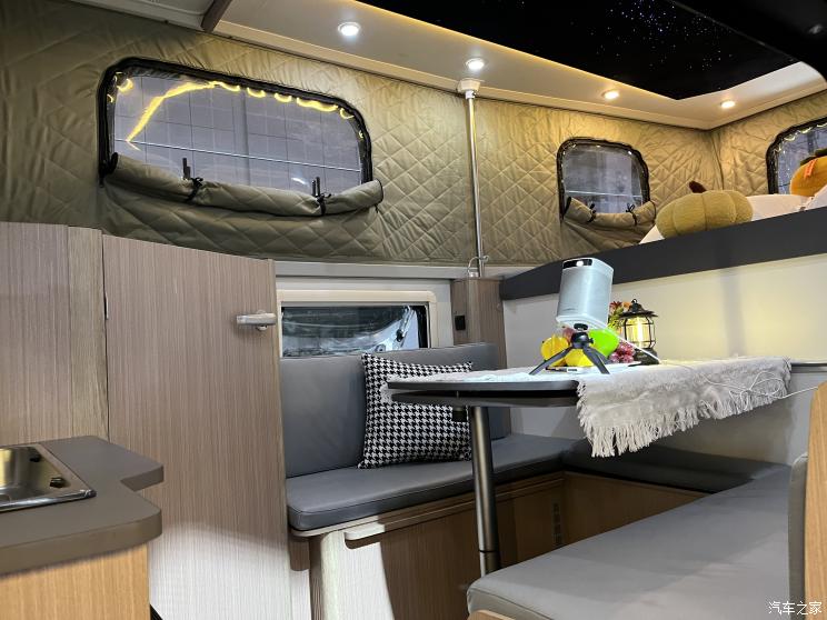 内饰方面,其基本沿用现款车型设计风格,三辐式多功能方向盘、窄条幅式液晶仪表、悬浮式大尺寸中控屏以及木质纹路饰板,大大提升这款车的品质感。尾厢部分,官方为这款车加入小餐桌、床体等。