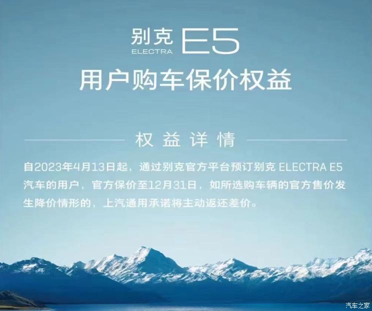 官方政策具体为:自2023年4月13日起,通过别克官方平台预订别克ELECTRA E5汽车的用户,官方保价至12月31日,如所选购车辆的官方售价发生降价情形的,上汽通用承诺将主动返还差价。