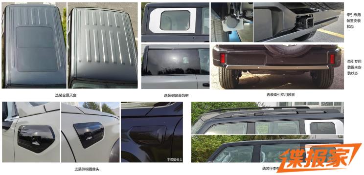 车身尺寸方面,新车长宽高分别为4790/1940/1895(1929)mm,轴距为2760mm。配置方面,根据车型不同提供电动踏板、全景天窗、侧窗装饰框、牵引专用装置、侧视摄像头等。同时,从申报信息来看,其准拖挂车总质量:不带制动750kg,带制动2500kg。并提供牵引专用装置,含拖车取电口、拖钩安装支架总成。