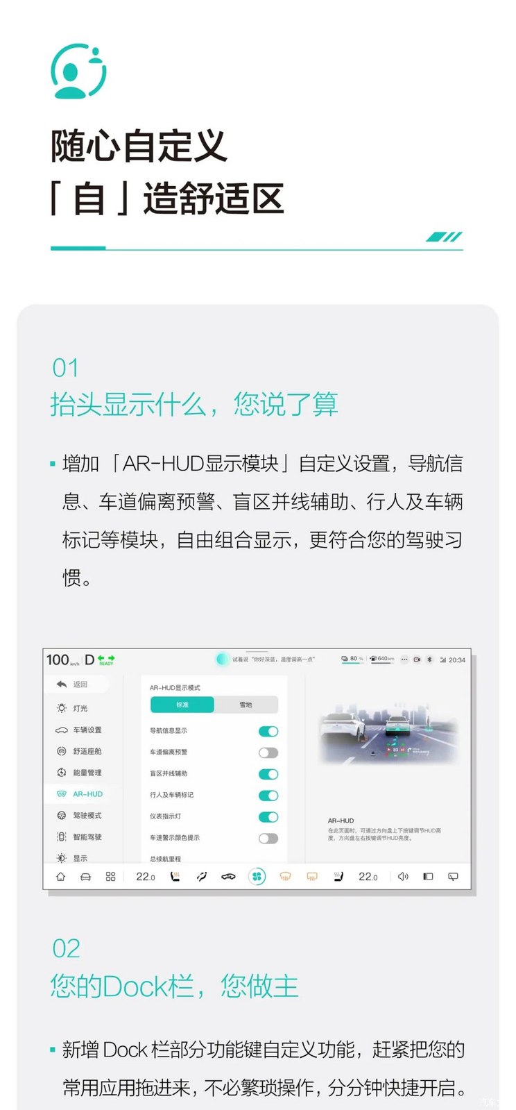 OTA内容:增加了AR-HUD显示模块自定义设置、新增Dock栏部分功能自定义功能、新增前照灯延时功能开关及时间设置选项等