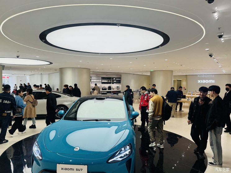 城市展厅整体面积不大,外立面均采用玻璃材质,内部的小米SU7十分醒目,对于车辆的展示起到不错的效果。来看店内,其提供两台展车,分别为海湾蓝和雅灰配色,整体内部布局非常紧凑,仅有展车和几把休息椅。对于车辆选装配件以及周边产品等并没有展示区域,可以提供试驾体验,但对于交付以及售后维修等并不支持。此外,店内配有2-3名销售人员,在人流量比较大的时候,人员配备稍显不足。