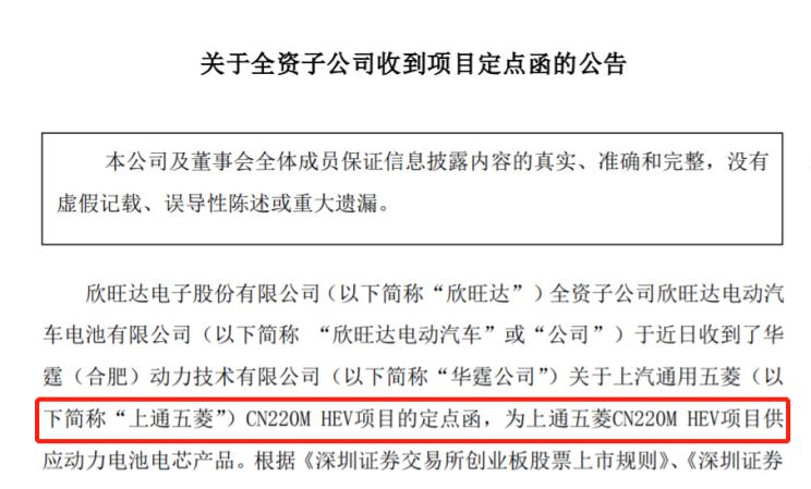 [本站 资讯] 近日,欣旺达发布公告称,公司于近日收到上汽通用五菱CN220M HEV项目的定点函…